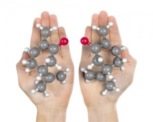 To see the perfect example of “chirality,” bring your hands up, palms facing you. They are mirror images but exactly opposite. They are different in that you cannot put a right-handed glove on your left hand. The term used to identify rotating to the right is dextrorotary, or “d,” and rotating to the left, levorotary, or “l.” (NOTE: The “d” and “l” enantiomers are NOT like the “d” form of a natural vitamin and the “dl” form of a synthetic vitamin.)