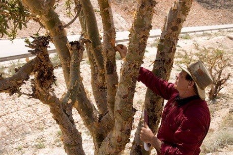 Gary is shown preparing to make the cut in the bark of this Boswellia sacra frankincense tree in Oman, which will start the resin flowing. The resin collected from these trees is distilled in Salalah, Oman, and becomes Young Living’s exquisite Sacred Frankincense essential oil.