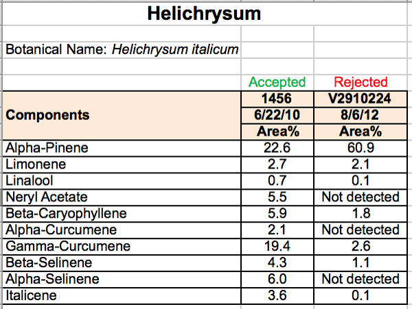 Here is a stark comparison that lists the constituents of two batches of Helichrysum essential oil that were for sale. One was accepted; the other, rejected. Do you know what was interesting? After I rejected the one in red, another company bought it and said it was pure.