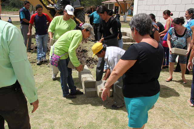 The parents of children attending the Young Living Academy in Chongon, Ecuador, lay the bricks for the expansion of the school to include high school students.