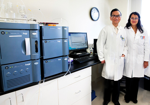 Dr. Chin Chiang, Sr. lab scientist, and Marilyn Contreras-Pinegar, Quality Control manager, are standing proudly next to our new HPLC instrument.