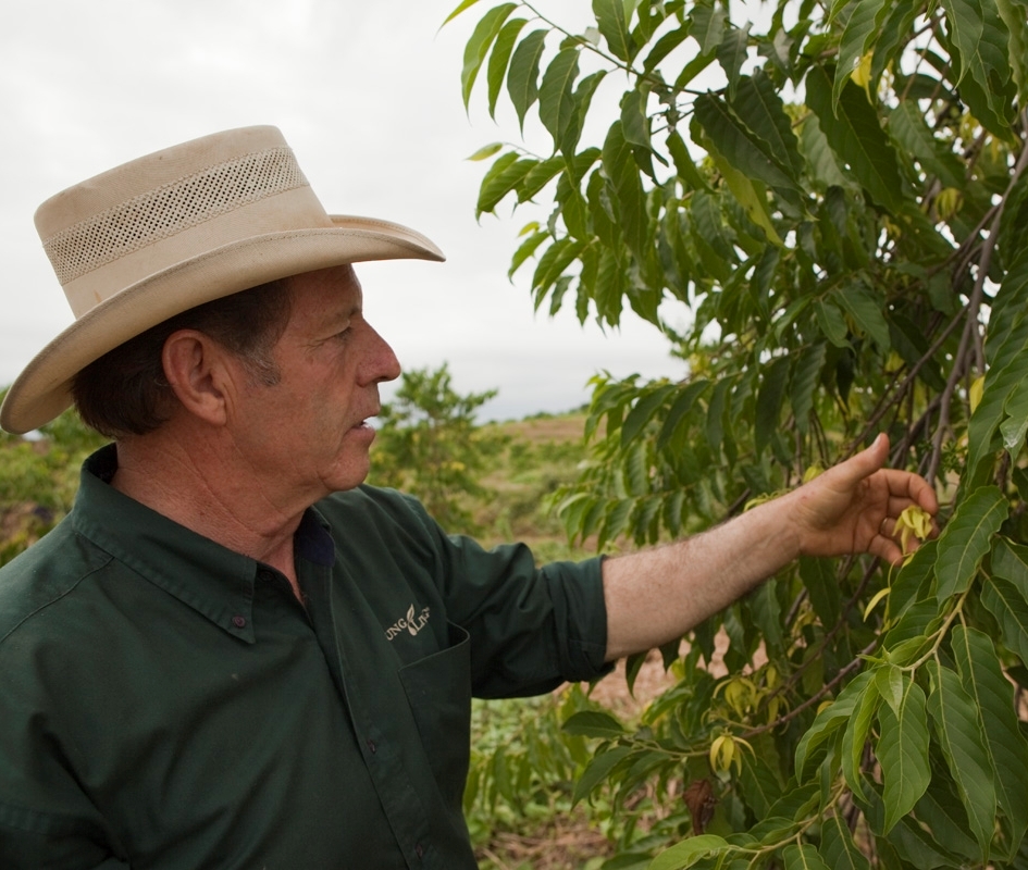 Gary is checking the fragrant flowers on ylang ylang trees grown on the Young Living farm in Ecuador, which will be distilled immediately after being picked.