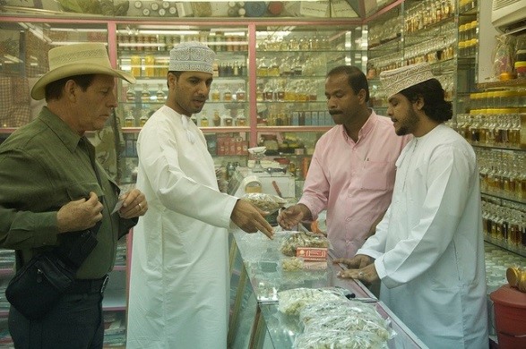 Choosing frankincense samples from a Salalah, Oman, shop to take back to the laboratory for testing.