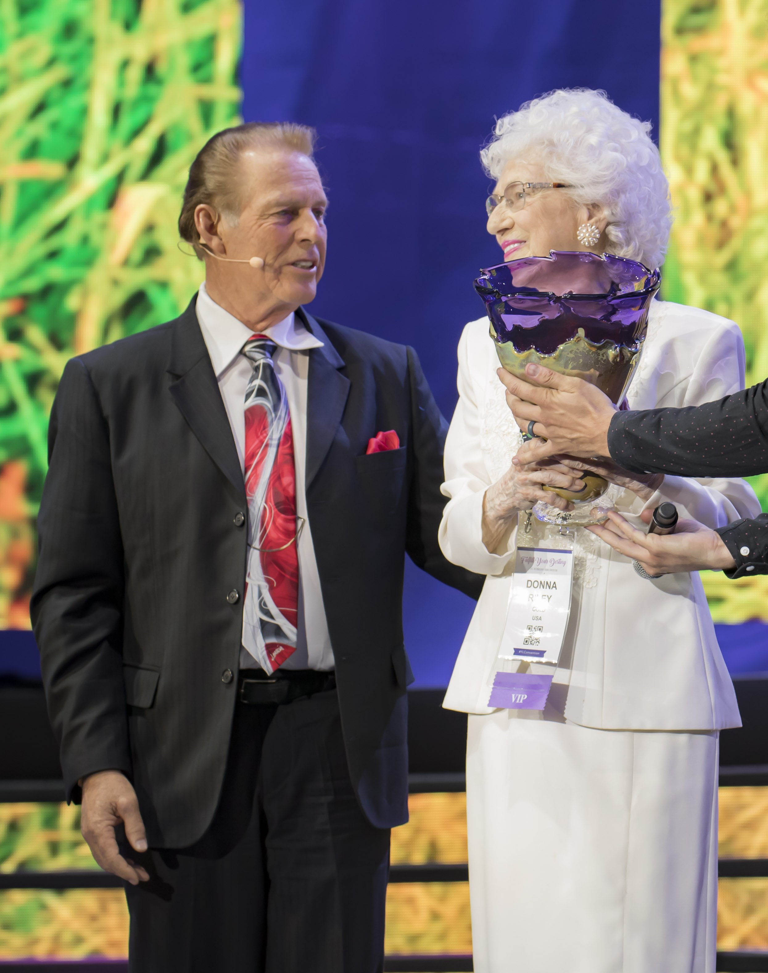 Donna Riley accepts the Spirit of Young Living Award from Gary Young, Convention 2017.