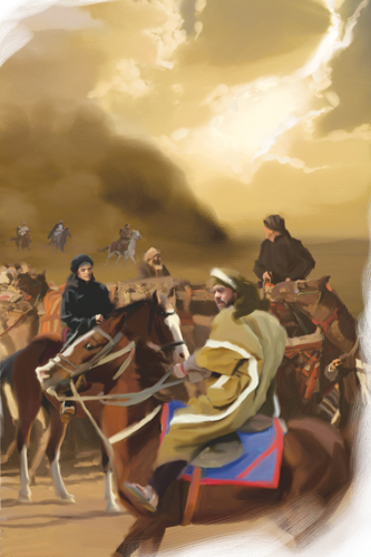 Shutran sends his captains to ride the outer flanks of the caravan to guide the camel drivers toward safety. Illustration copyright © YL Wisdom 2010.